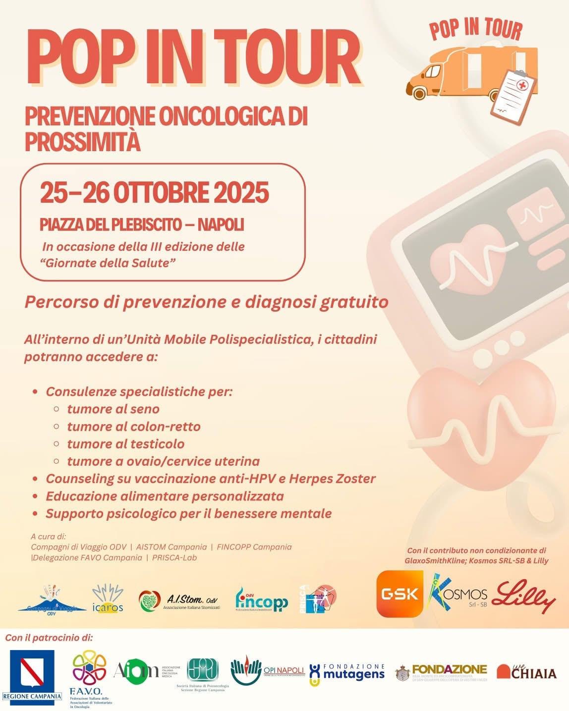 La prevenzione oncologica di prossimità arriva nel cuore di Napoli con l’iniziativa “Pop in Tour“, un percorso gratuito di diagnosi e screening. L’evento si terrà sabato 25 e domenica 26 ottobre 2025, in Piazza del Plebiscito, in occasione della III edizione delle “Giornate della Salute”.