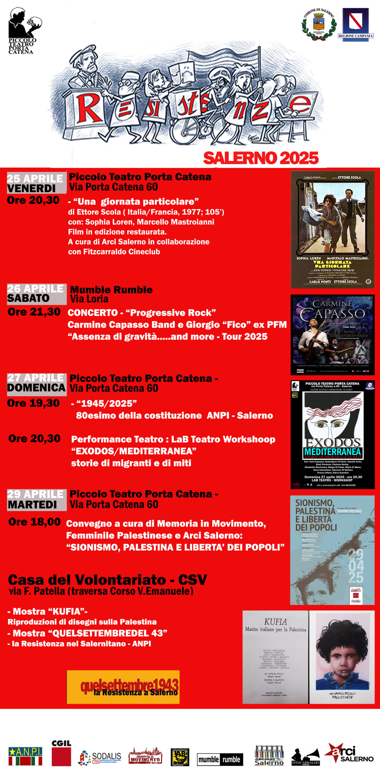 - Organizzatori: Piccolo Teatro Porta Catena, Mumble Rumble, ANPI Salerno, Performance Teatro, Memoria in Movimento, Sodalis CSVS ETS