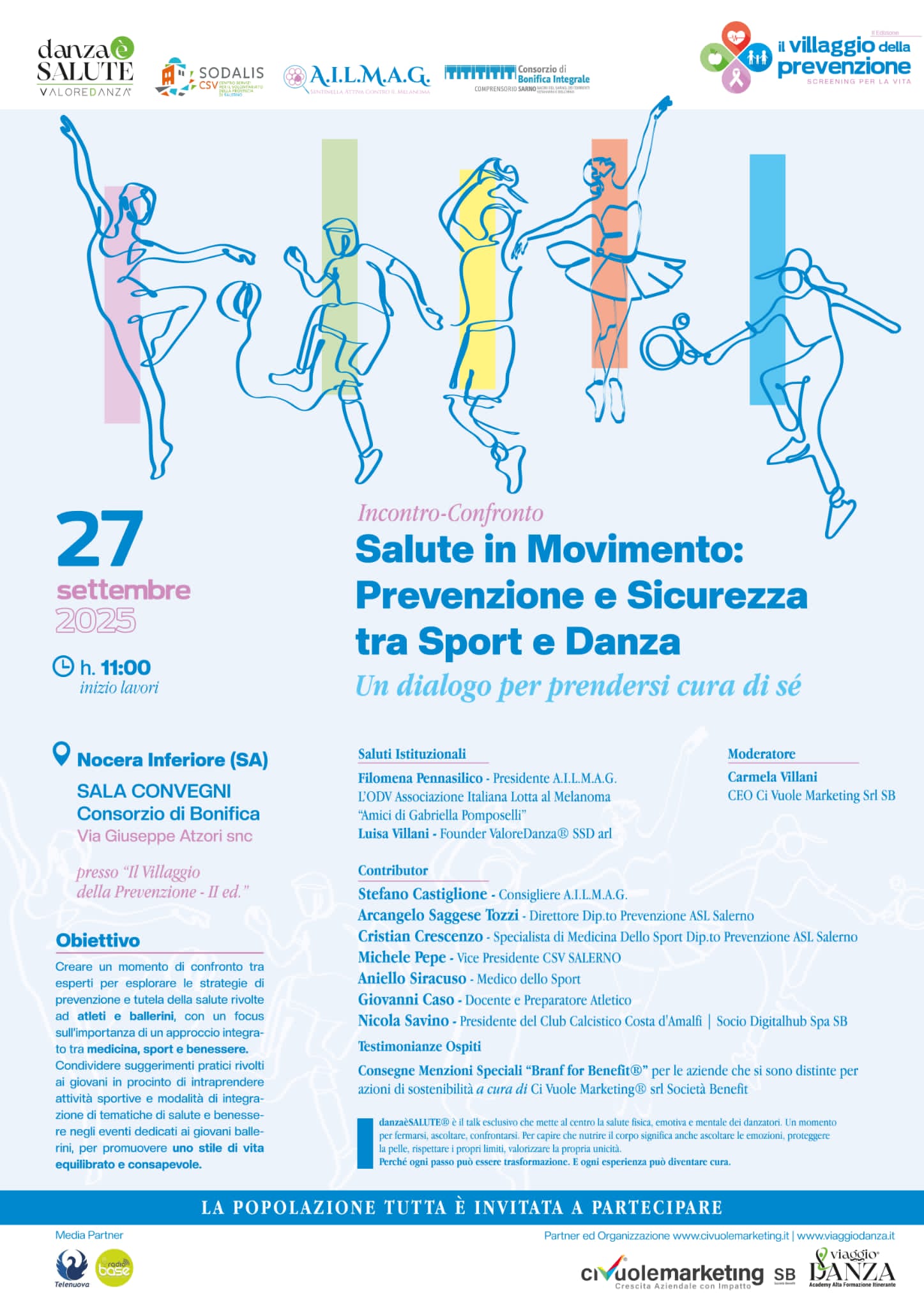 A.I.L.M.A.G. e Sodalis, nell’ambito dei Laboratori di cittadinanza: autunno di comunità, organizzano l’evento Salute in Movimento: Prevenzione e Sicurezza tra Sport e Danza. Il Laboratorio sarà parte integrante degli eventi del Villaggio della prevenzione che si terrà a Nocera Inferiore presso la Sala Convegni del Consorzio di Bonifica in Via Giuseppe Atzori snc.