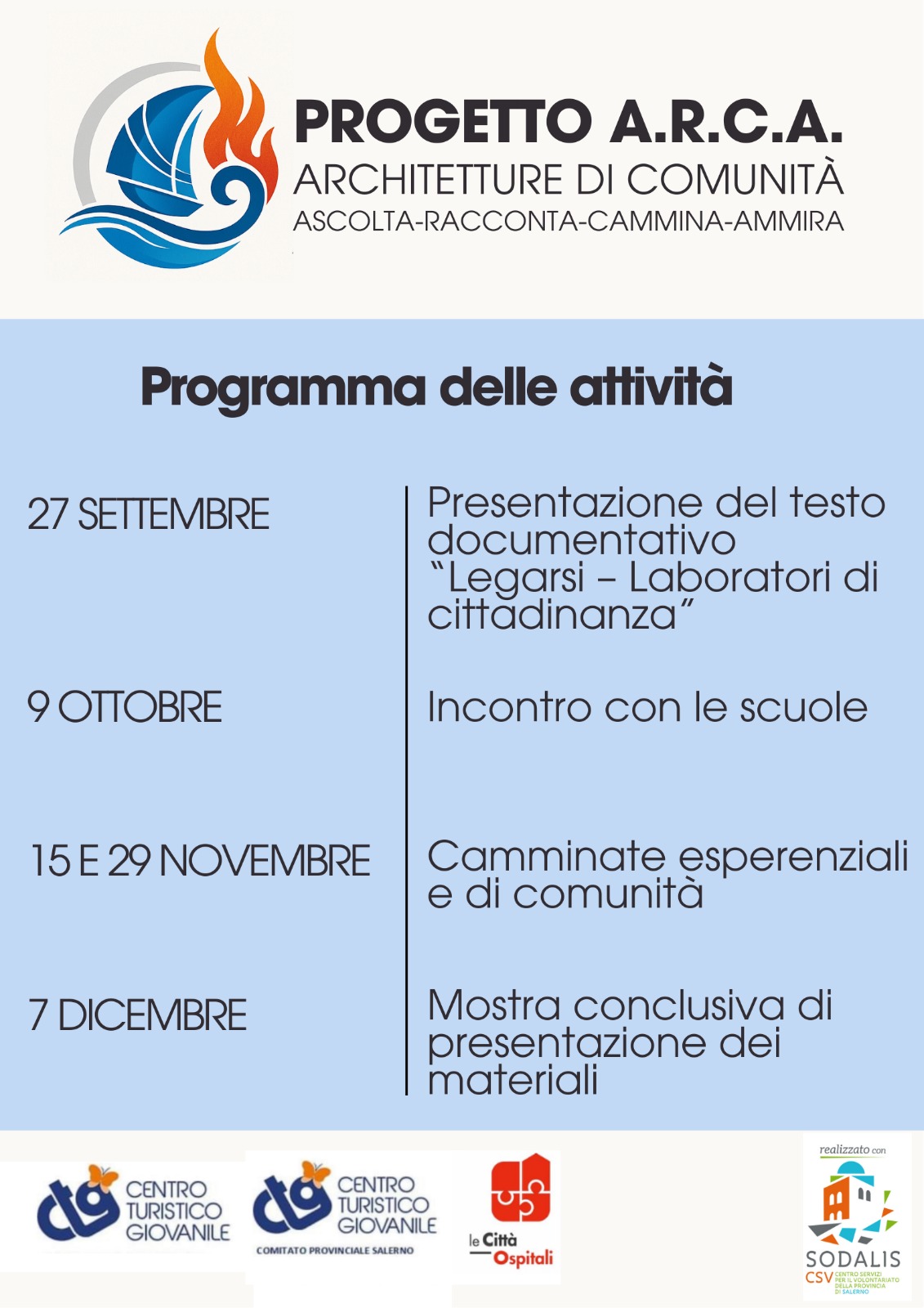 Prende il via il A.R.C.A. – Architetture di Comunità: Ascolta-Racconta-Cammina-Ammira, un’iniziativa che mira a promuovere la cittadinanza attiva e la valorizzazione del territorio attraverso diverse attività esperienziali. L’attività è realizzata nell’ambito dei Laboratori di cittadinanza – autunno di comunità da Sodalis CSV Salerno e il Centro Turistico Giovanile (CTG), il Comitato Provinciale Salerno del CTG.