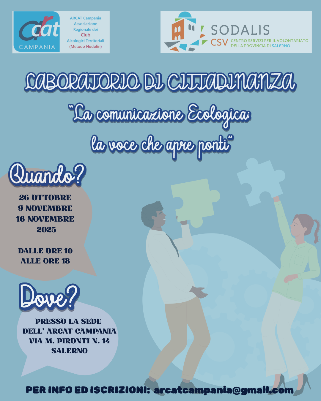L’associazione ARCAT Campania (Associazione Regionale dei Club Alcolici Territoriali Metodo Hudolin) e Sodalis CSV Salerno, organizzano nell’ambito dei Laboratorio di Cittadinanza autunno di comunità, un ciclo di incontri dedicato al “: La comunicazione Ecologica: la voce che apre ponti”.