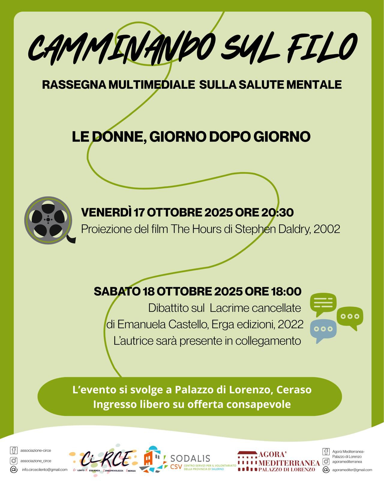 La rassegna multimediale “Camminando sul filo: Rassegna multimediale sulla salute mentale” prosegue a Ceraso, al Palazzo di Lorenzo, con un nuovo ciclo di eventi focalizzato sulla condizione femminile e il benessere psicologico, intitolato “Le donne, giorno dopo giorno“. L’iniziativa è promossa dall’Associazione CIRCE e Sodalis CSV Salerno con il supporto di Agora’ Mediterranea nell’ambito dei Laboratori di cittadinanza autunno di comunità.