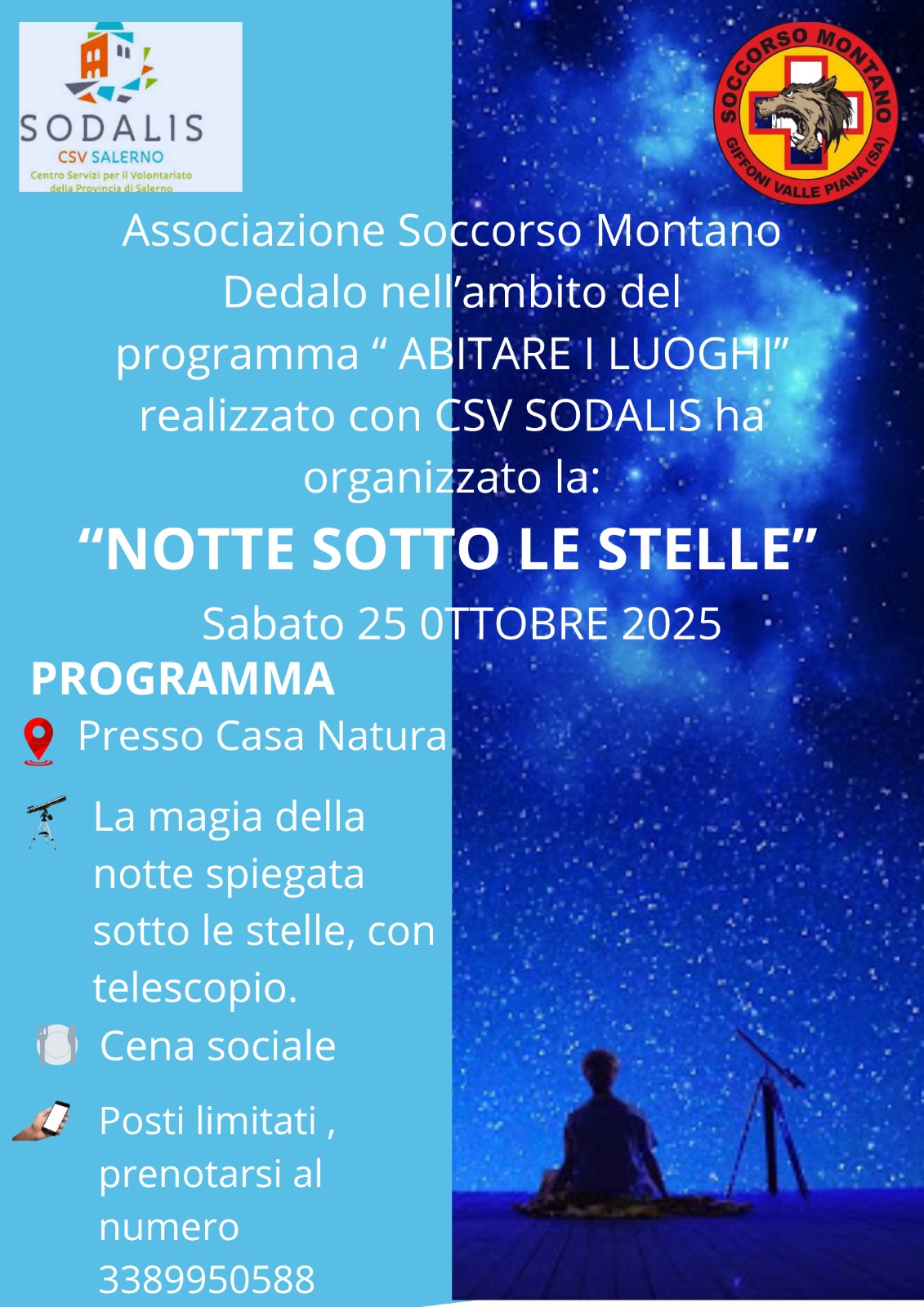 L’Associazione Soccorso Montano Dedalo, nell’ambito del programma “Abitare i luoghi” realizzato con Sodalis CSV Salerno, invita la cittadinanza a partecipare a un evento speciale dedicato all’osservazione del cielo: la “Notte sotto le Stelle”.