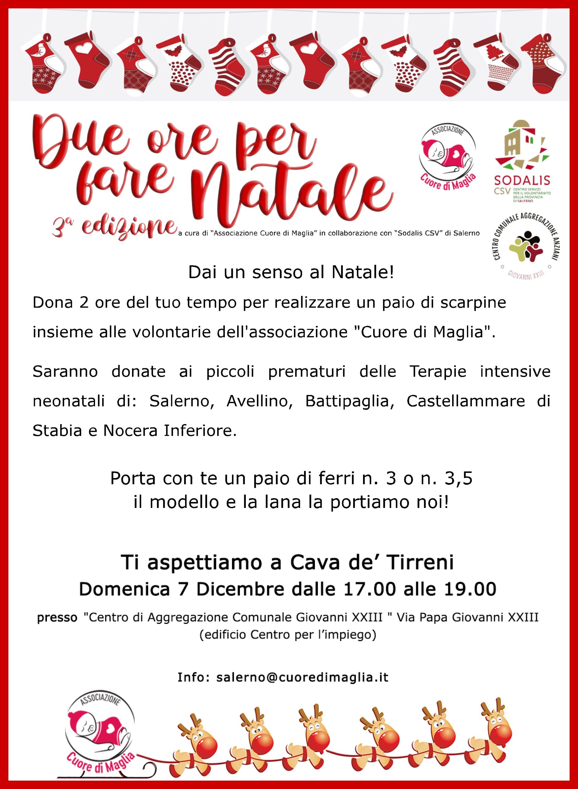“Due ore per fare Natale”: A Cava de’ Tirreni il Calore del “Cuore di Maglia” per i Prematuri. La solidarietà si fa con ago e filo grazie alla 3ª edizione dell’iniziativa “Due ore per fare Natale”, promossa dall’associazione “Cuore di Maglia” e con Sodalis CSV Salerno. Questo gesto d’amore e cura rientra nel vasto programma delle Micro Azioni Natalizie (MAN) 2025, che animano il territorio salernitano.