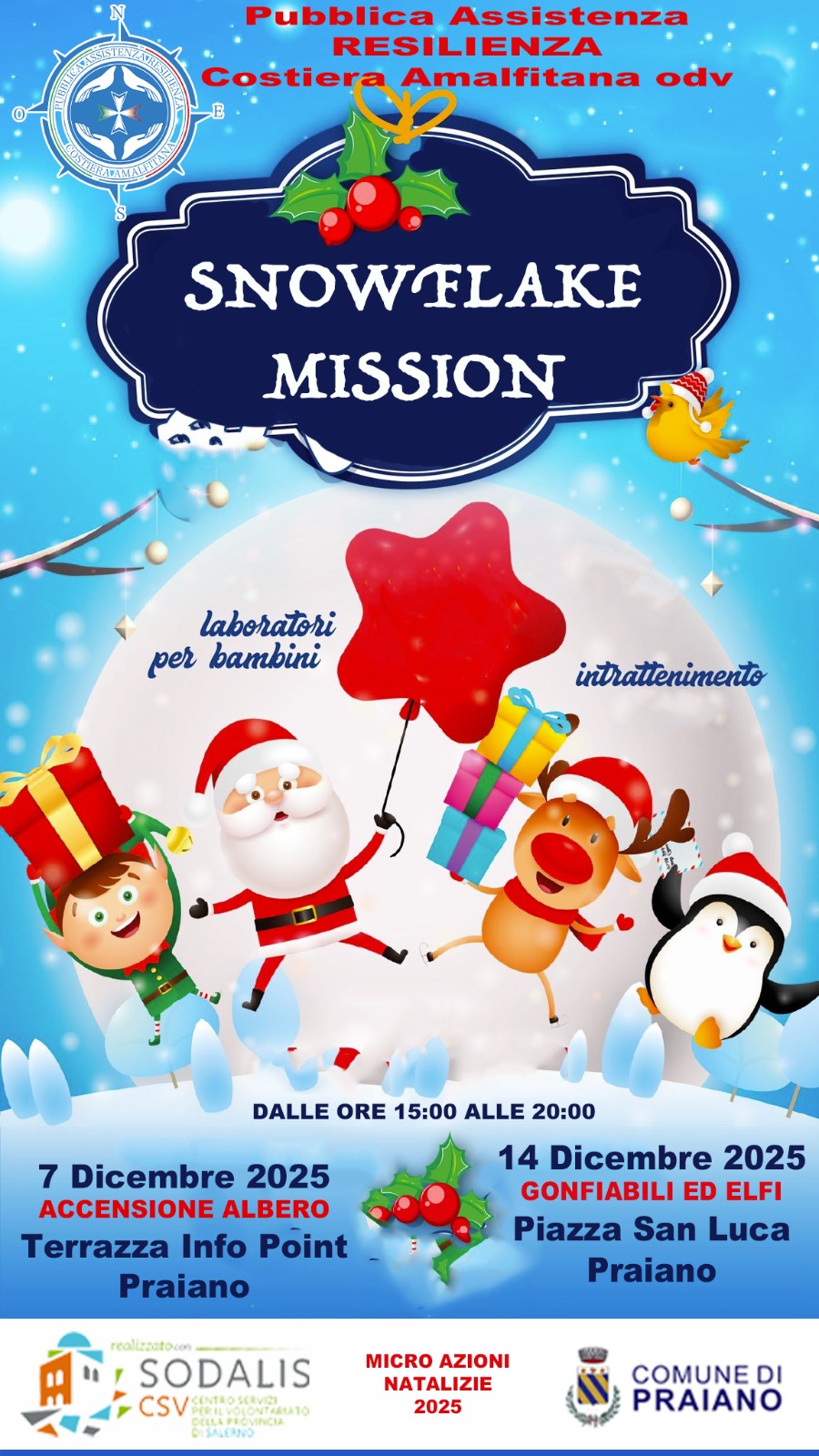 La Pubblica Assistenza Resilienza Costiera Amalfitana ODV e Sodalis CSV Salerno, in collaborazione con il Comune di Praiano, nell’ambito delle Micro Azioni Natalizie (M.A.N.) 2025, lanciano la “Snowflake Mission”: due giornate interamente dedicate all’intrattenimento, alla magia del Natale e ai bambini della Costiera.