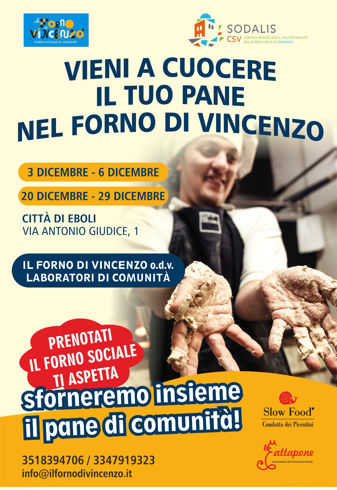 I laboratori di panificazione si terranno presso la sede dell’associazione, in Via Antonio Giudice, 1, a Eboli, in quattro date distribuite tra inizio e fine dicembre: