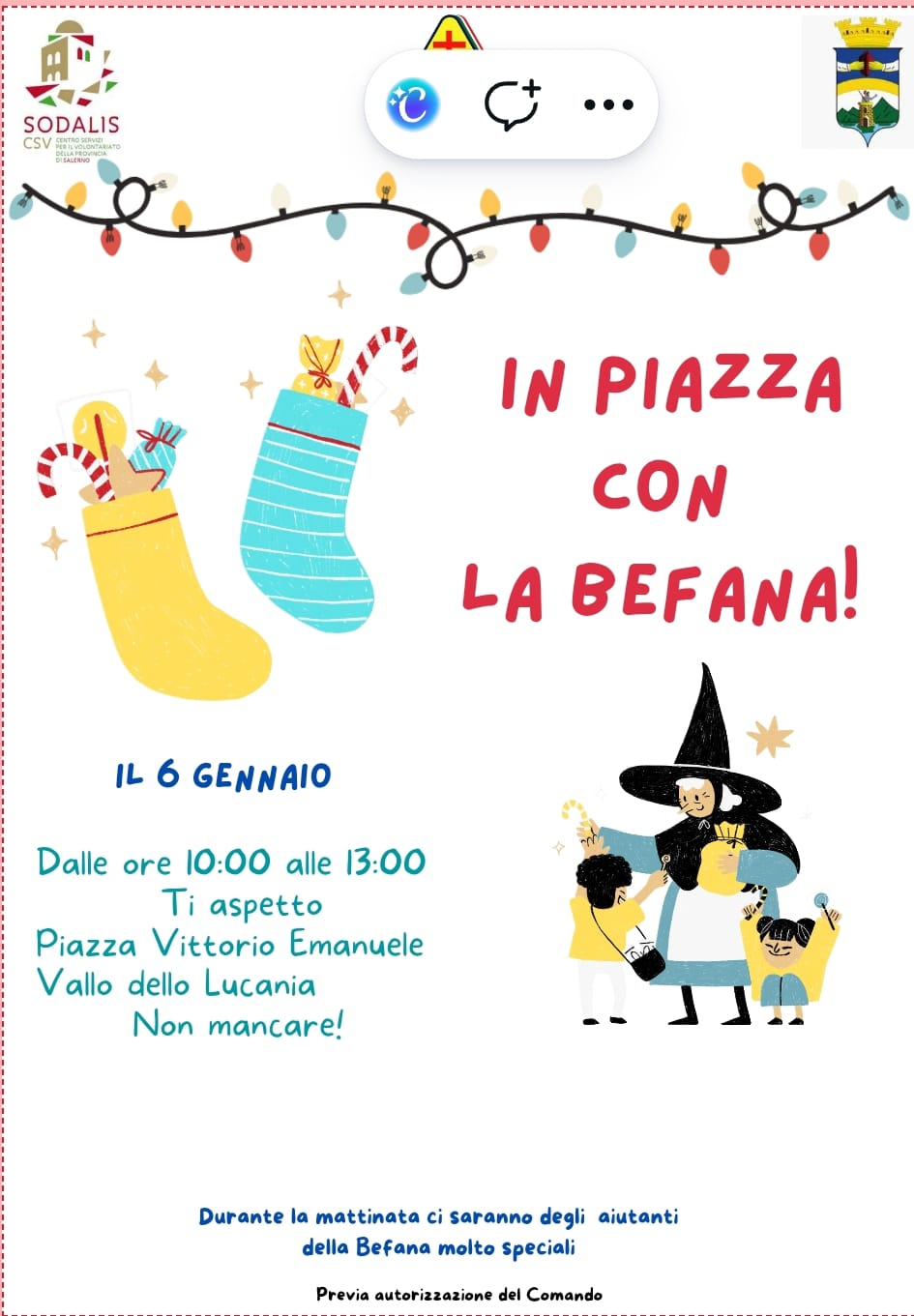 Un elemento di particolare interesse è l’annuncio della presenza di “aiutanti della Befana molto speciali” (previa autorizzazione del Comando), un dettaglio che preannuncia una mattinata ricca di sorprese e coinvolgimento per le famiglie.