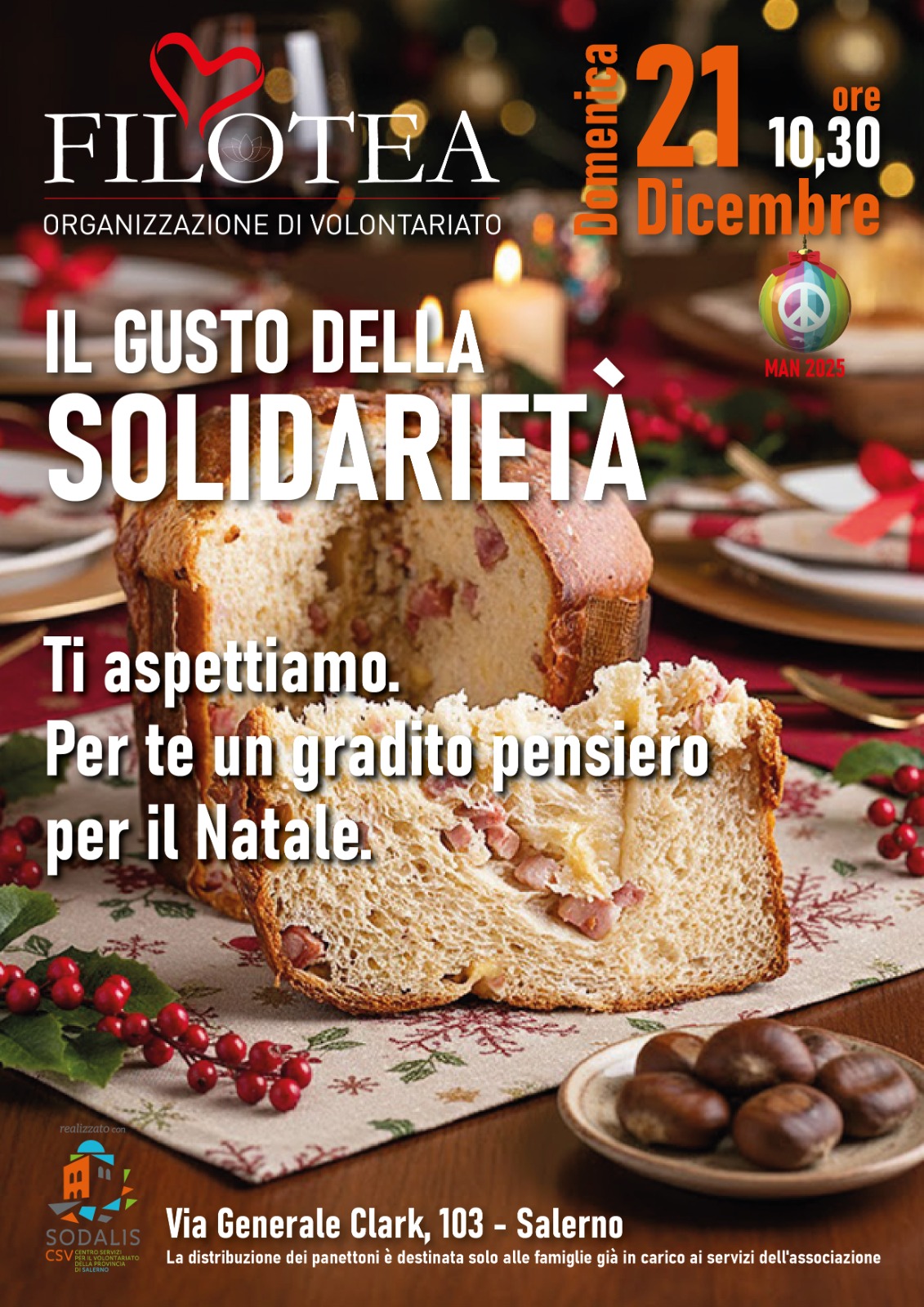Un significativo atto di sostegno nel calendario delle M.A.N. (Micro Azioni Natalizie) 2025, la rassegna di iniziative promossa da Sodalis CSV Salerno – Centro Servizi per il Volontariato. con l’evento, denominato “Il Gusto della Solidarietà”, è organizzato da Filotea Organizzazione di Volontariato e focalizzato sulla vicinanza alle famiglie più bisognose.
