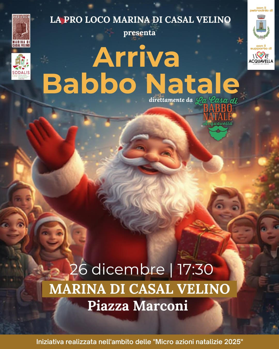 - Dettagli: L’evento è presentato da La Pro Loco Marina di Casal Velino e vede il patrocinio del Comune e il supporto di I Love Acquavella. Babbo Natale arriverà direttamente da “La Casa di Babbo Natale Acquavella” per incontrare i bambini e raccogliere i loro desideri, in un’iniziativa che accende la magia delle feste subito dopo il Natale.