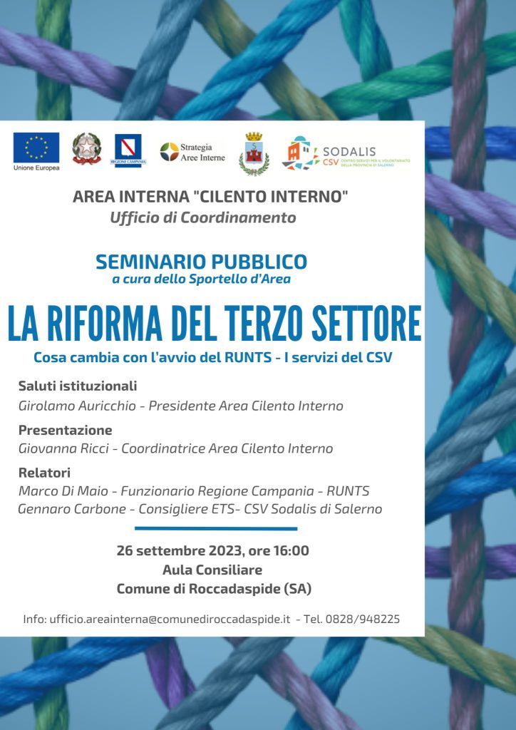 18 Set iniziative, Vita associativa La riforma del Terzo Settore 18 Settembre 2023 By csvsalerno Martedì 26 settembre 2023 a Roccadaspide seminario pubblico dal titolo: "La riforma del Terzo Settore, cosa cambia con l'avvio del RUNT... Continua a leggere