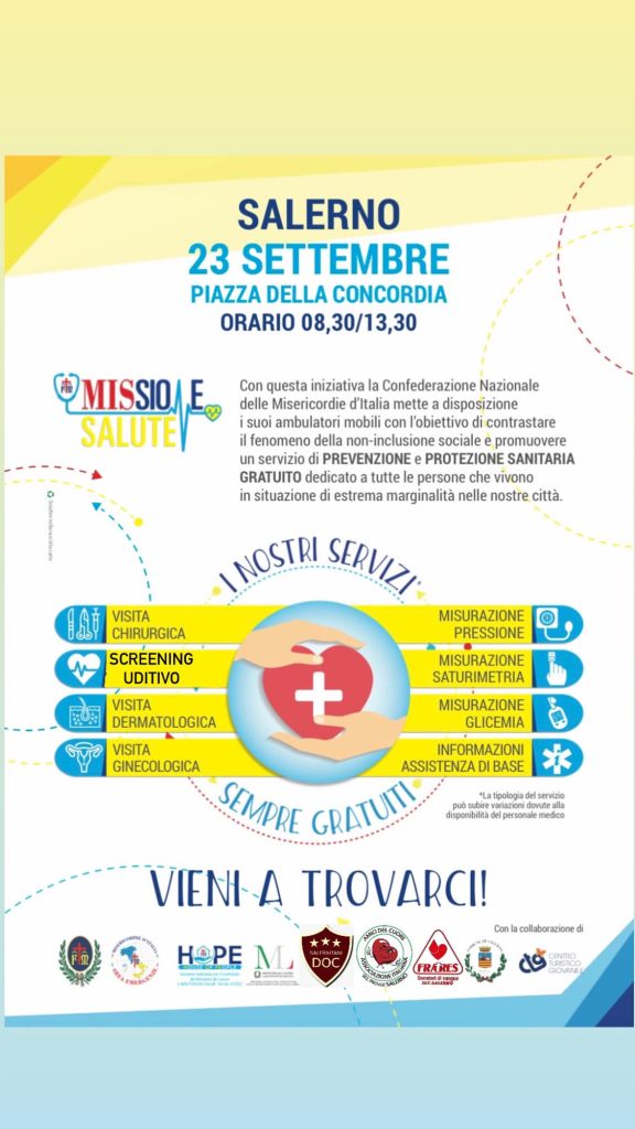 22 Set Iniziative ETS Salerno, Missione Salute con la Misericordia di Salerno 22 Settembre 2023 By csvsalerno Sabato 23 settembre 2023, dalle ore 8.30 alle 13.30, in Piazza della Concordia a Salerno mattinata dedicata alla prevenzione e protezio... Continua a leggere