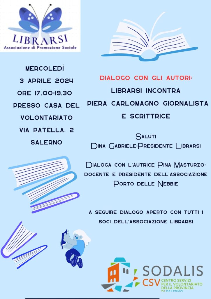 02 Apr Iniziative ETS, Promozione, orientamento e animazione territoriale, servizi ai cittadini Librarsi incontra Piera Carlomagno 2 Aprile 2024 By alfredo Il 3 aprile Librarsi incontra Piera Carlomagno giornalista e scrittrice, i suoi romanzi, ambientati in Basilicata, hanno come protagoni... Continua a leggere