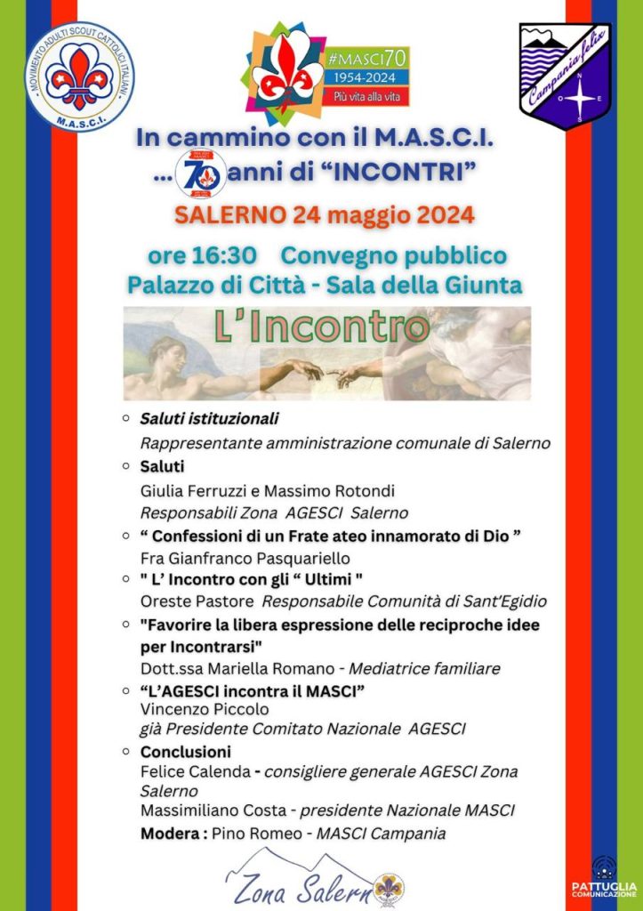 22 Mag Iniziative ETS, Promozione, orientamento e animazione territoriale, servizi ai cittadini M.A.S.C.I. 70 anni di incontri 22 Maggio 2024 By alfredo Pubblichiamo la notizia dell'incontro del 24 maggio a Salerno presso il palazzo di Città - sala della giunta per l'incontro del M.A.S.C... Continua a leggere
