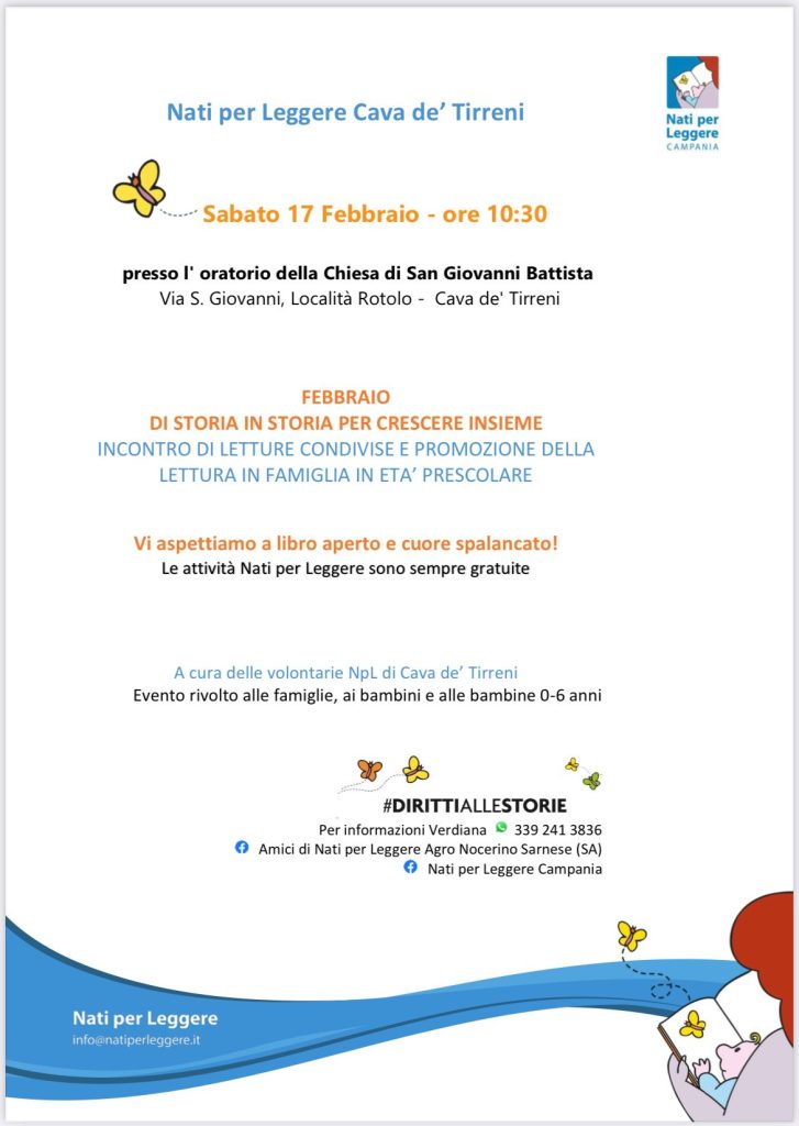 15 Feb Iniziative ETS Nati per leggere 15 Febbraio 2024 By alfredo Sabato 17 febbraio ore 10.30 l'associazione Nati per leggere presso l'oratorio di San Giovanni a Cava de' tirreni presenta l'evento di ... Continua a leggere