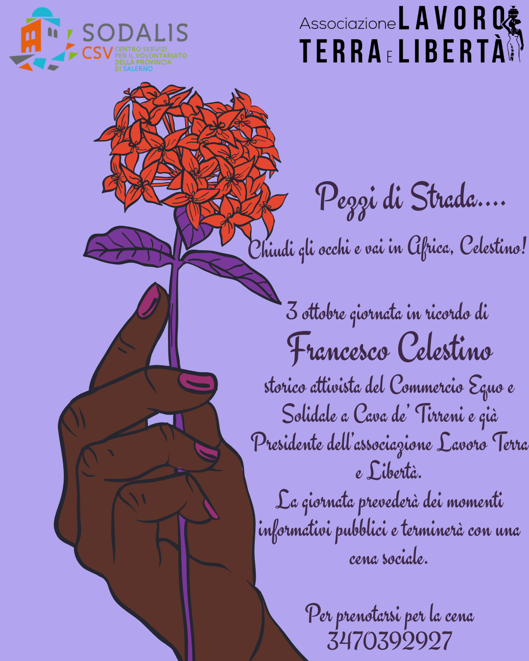 L’associazione Lavoro Terra e Libertà e Sodalis nell’ambito degli abitare i luoghi organizzano l’evento “Pezzi di Strada…. Chiudi gli occhi e vai in Africa, Celestino!” il 3 ottobre a Cava de’ Tirreni in piazza Duomo.